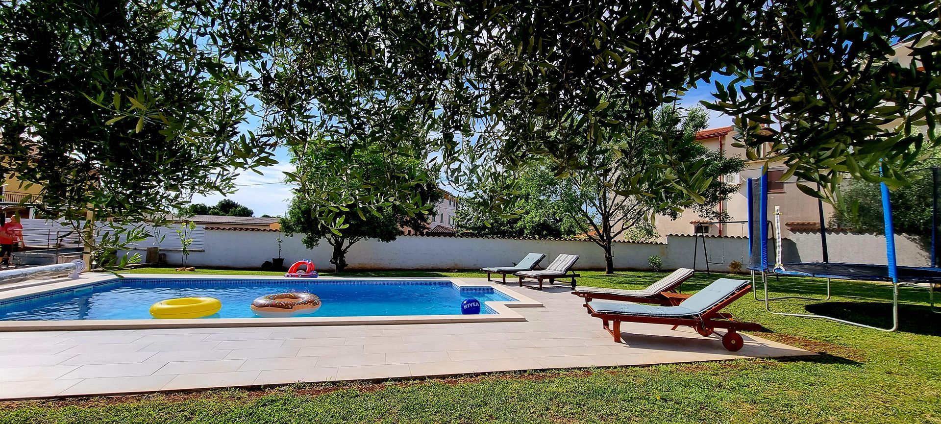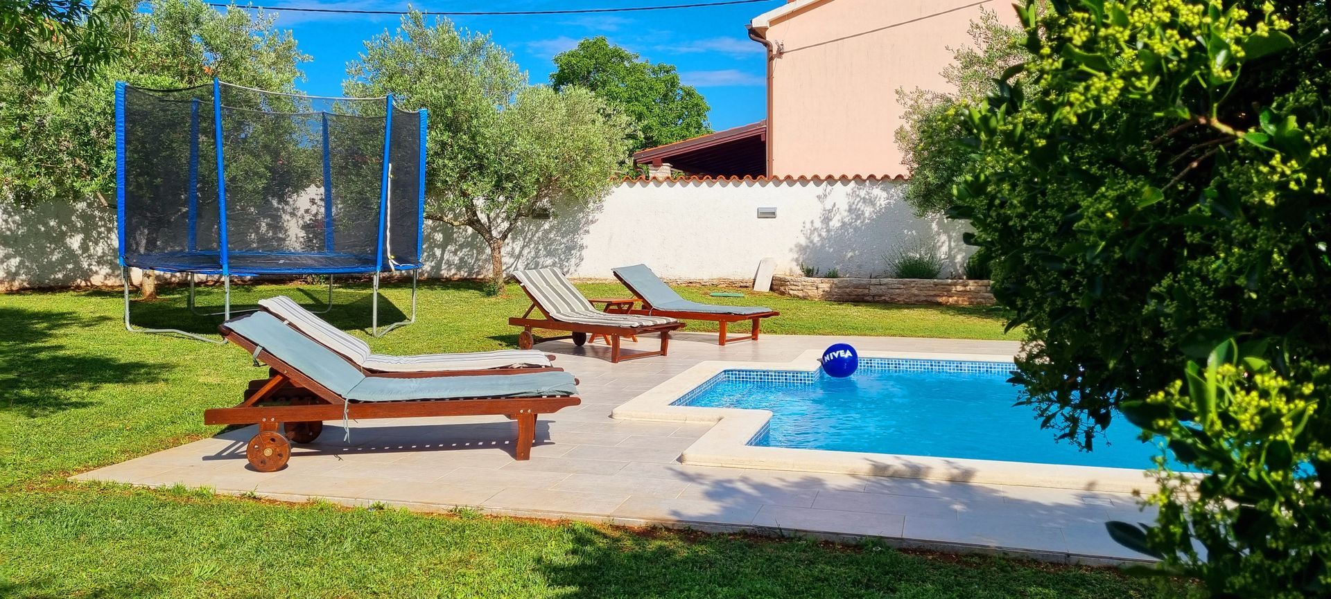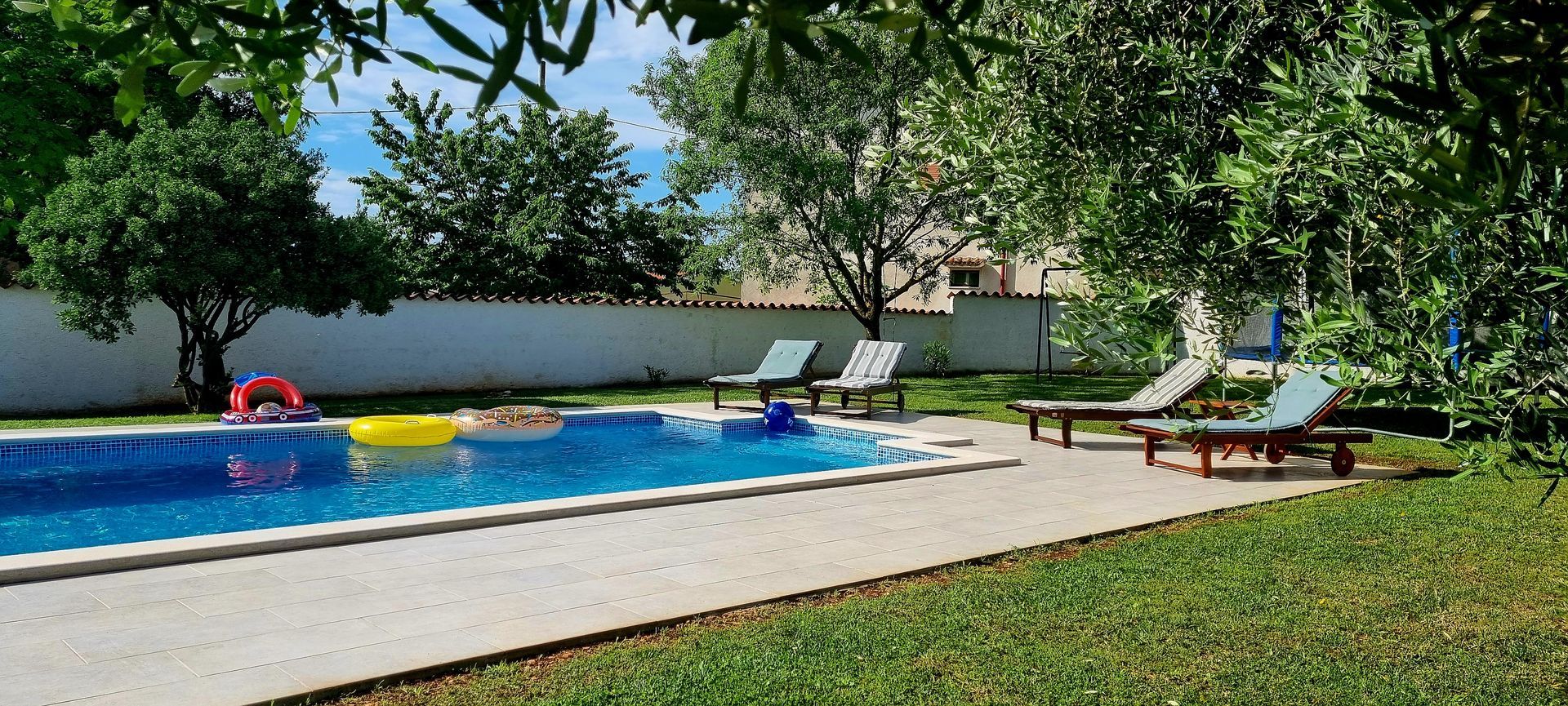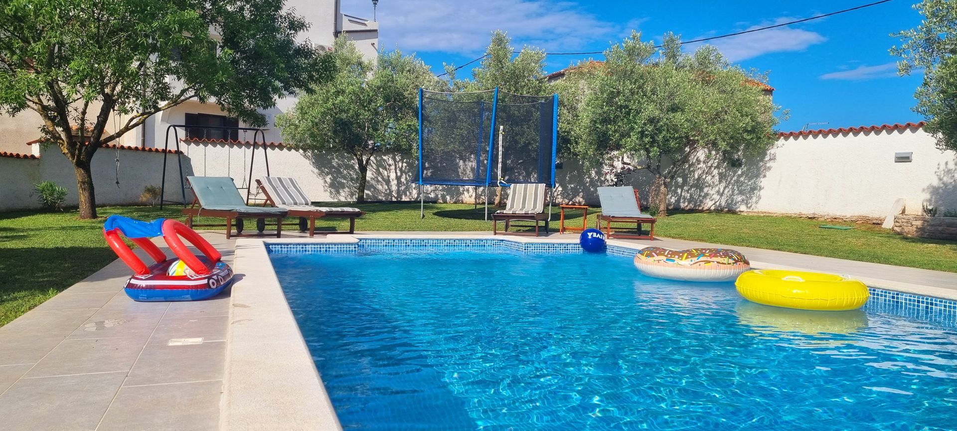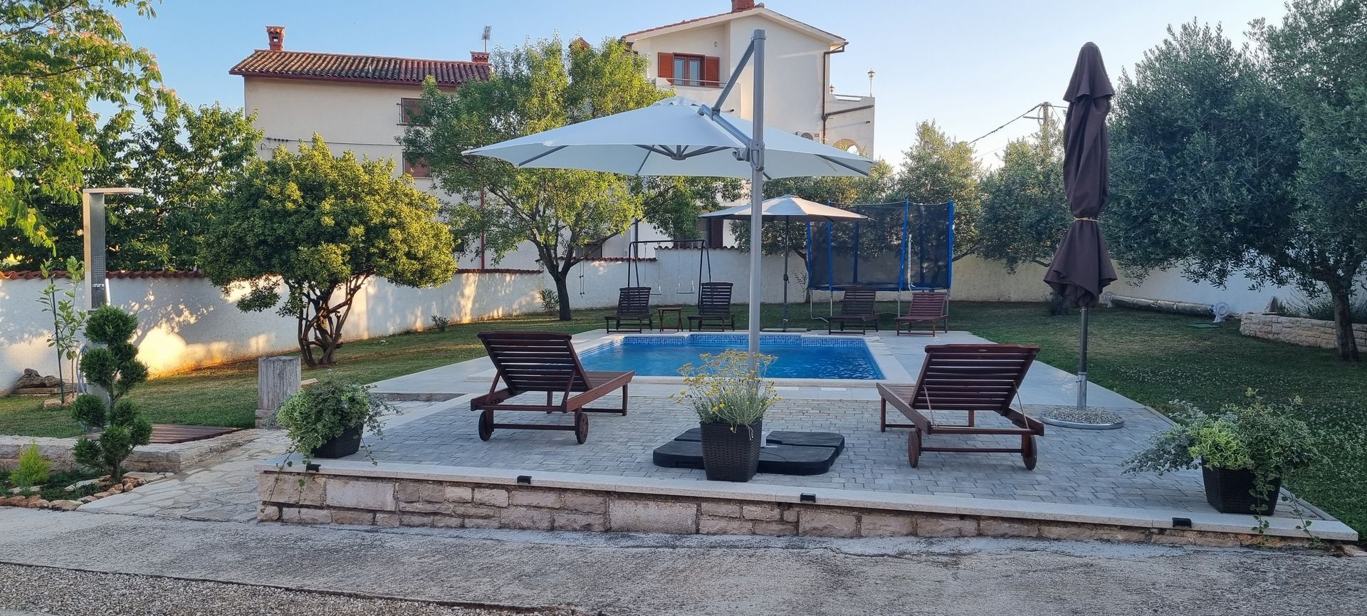 Das großzügige, liebevoll und sehr gut ausgestattete Ferienhaus befindet sich Medulin und geht über 2 Stockwerke. Sie haben hier 3 Schlafzimmer mit Doppelbetten, 2 Badezimmer mit Dusche, einen sehr gut ausgestatteten Küchen- und Wohnbereich, sowie einen Balkon mit Blick aufs Meer. Die Terrasse des Hauses bietet als Highlight den schönen Pool für entspannte Urlaubstage. Der Pool ist ungefähr 3x6m groß.
