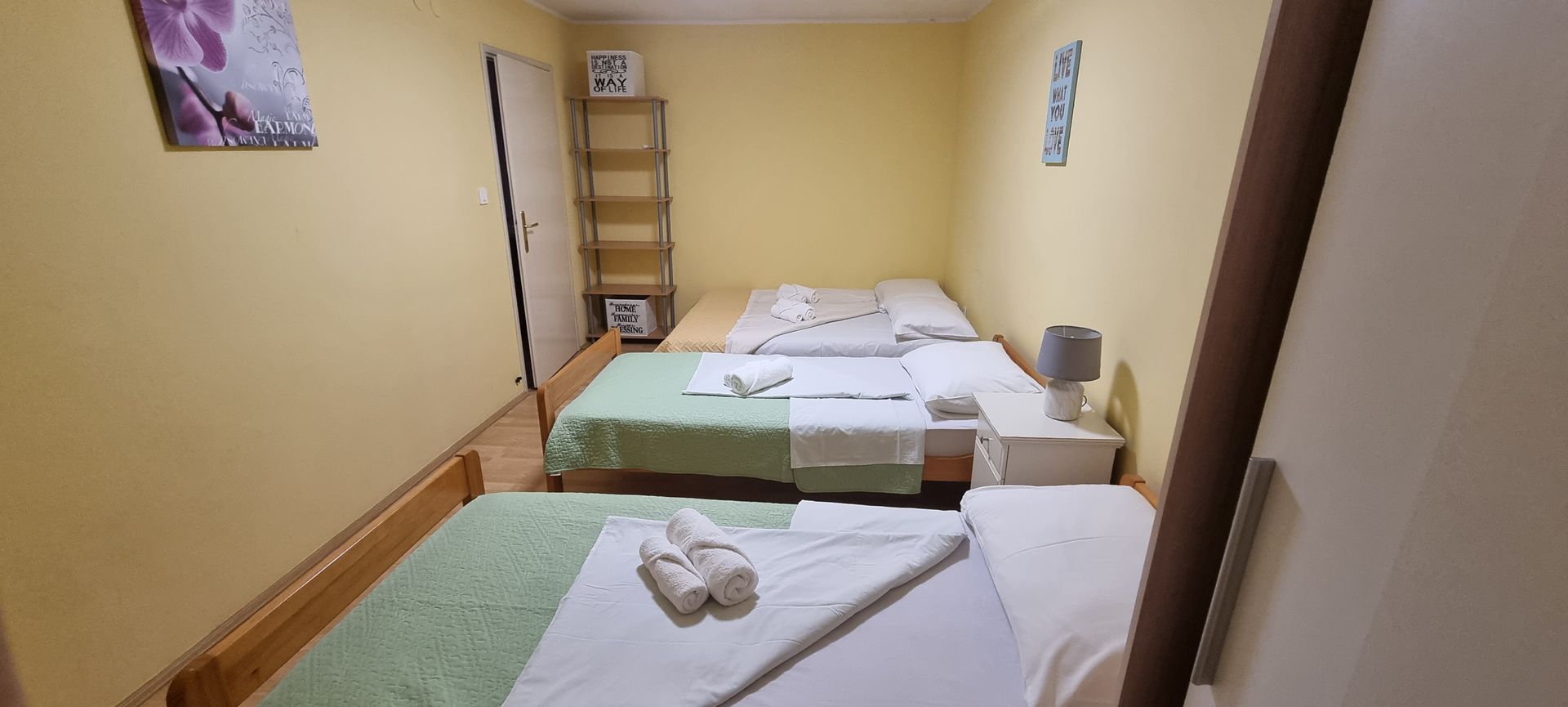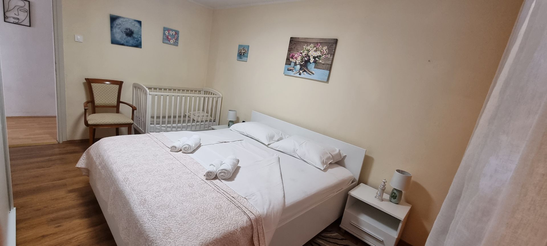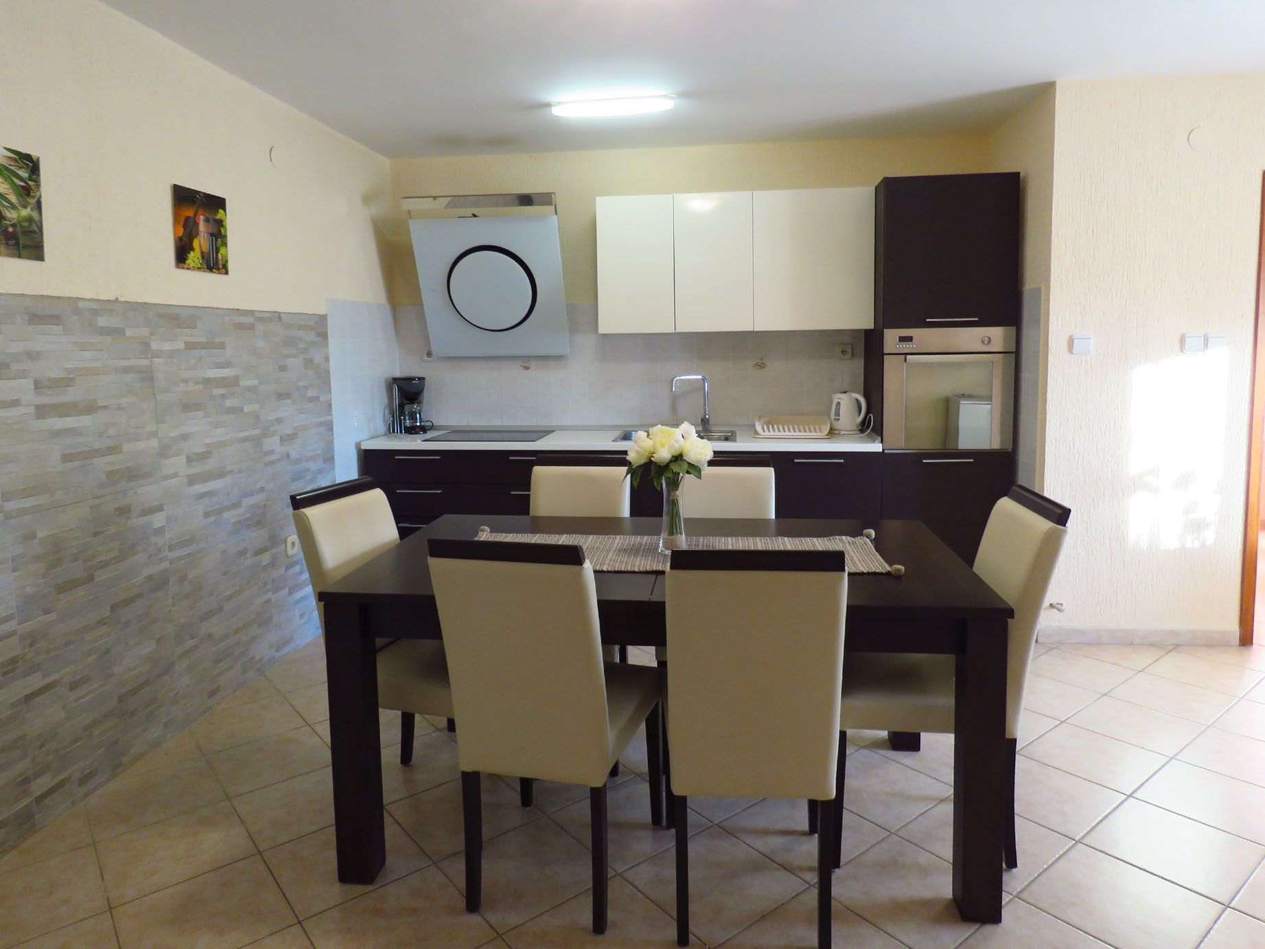 Das Apartment befindet sich im Erdgeschoss des Hauses. Sie haben hier zwei große Schlafzimmer mit Doppelbetten, ein Badezimmer mit einer Dusche, ein Wohnzimmer mit einer Schlafcouch und einer Küchenzeile mit einer Spülmachine. Eine schöne große Terrasse gehört mit dazu.