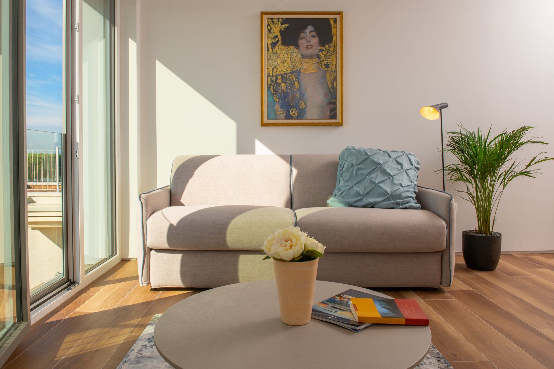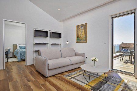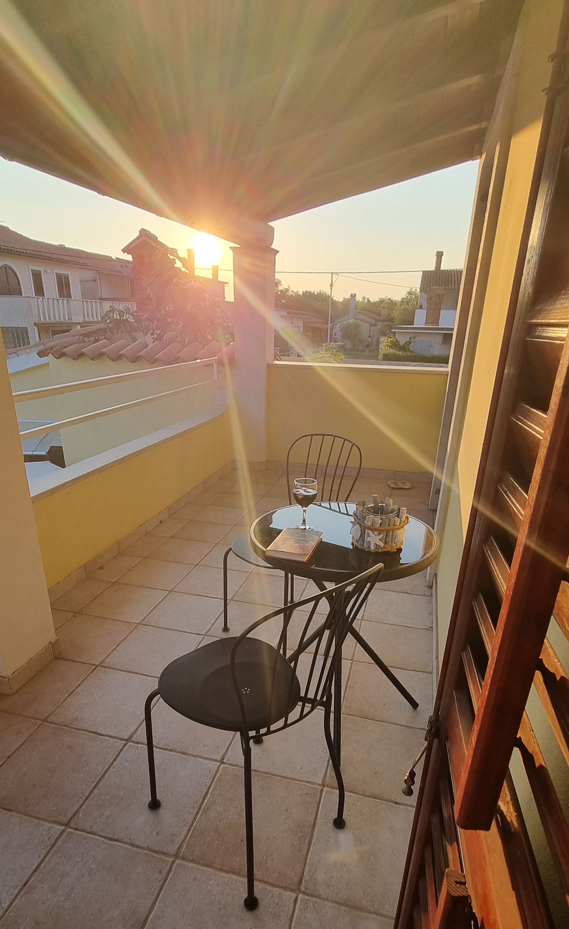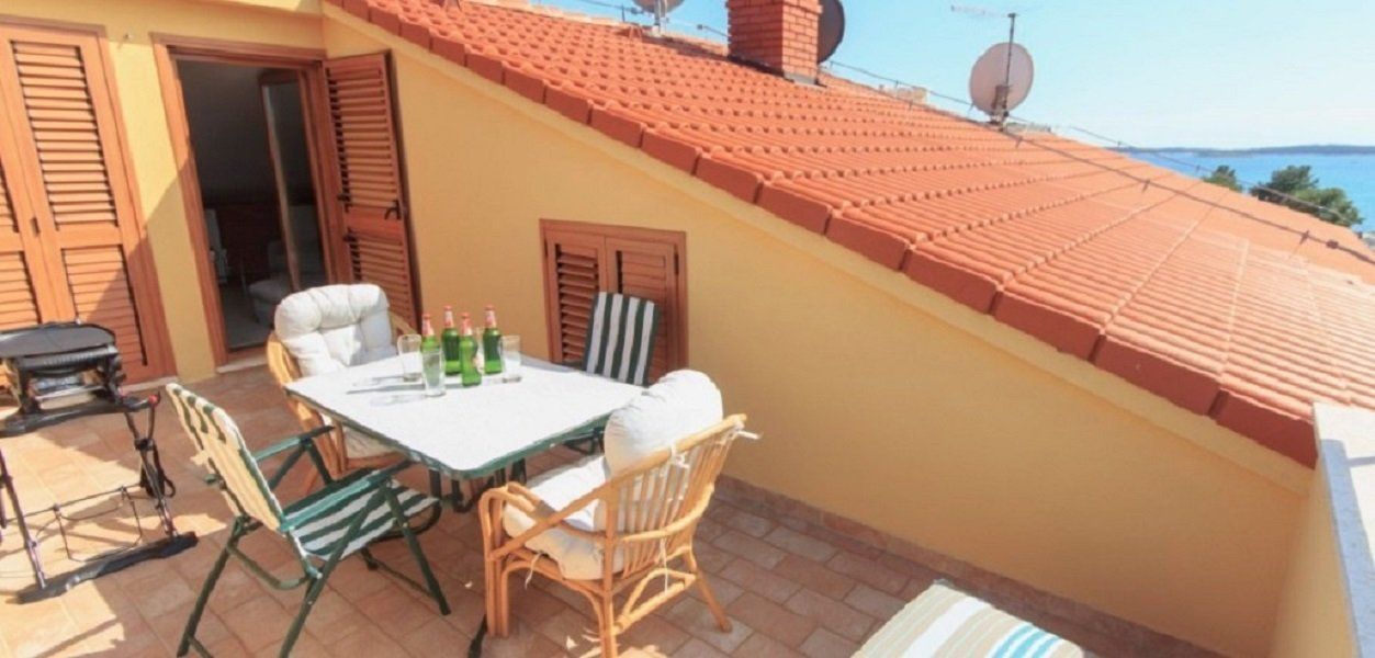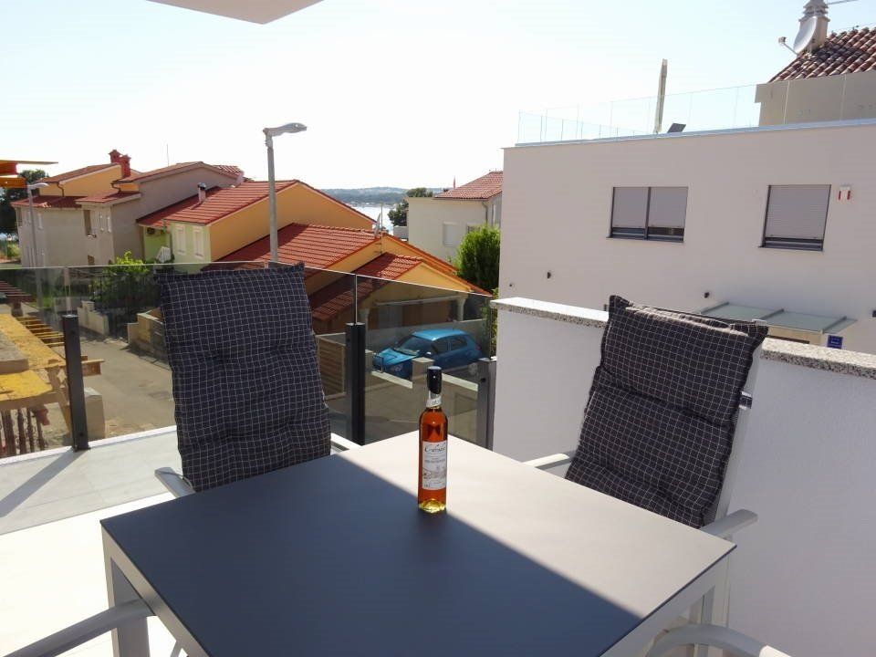 Das Apartment liegt im obersten Geschoss des Hauses. Es hat einen Balkon mit herrlichem Blick aufs Meer.