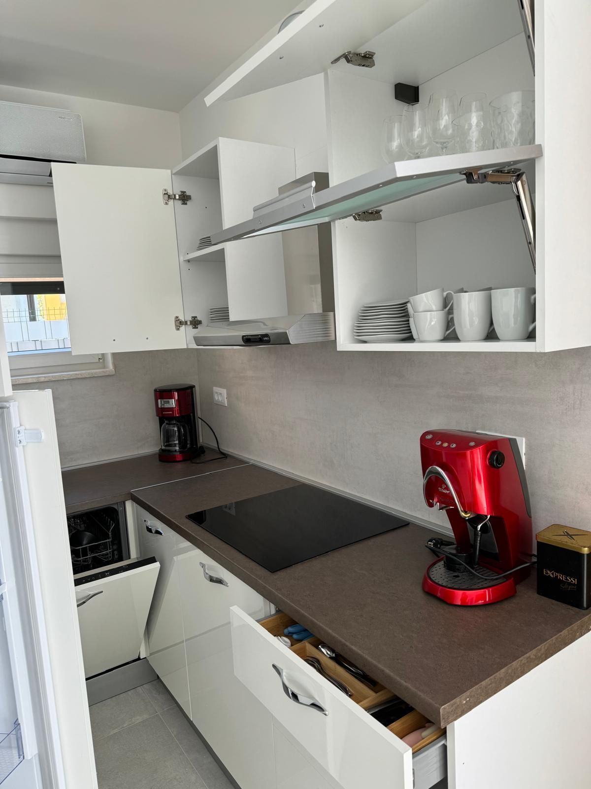 Eine schön eingerichtete Küche (inkl. Kaffeemaschine, Spülmaschine und Wasserkocher) rundet das ganze ab.